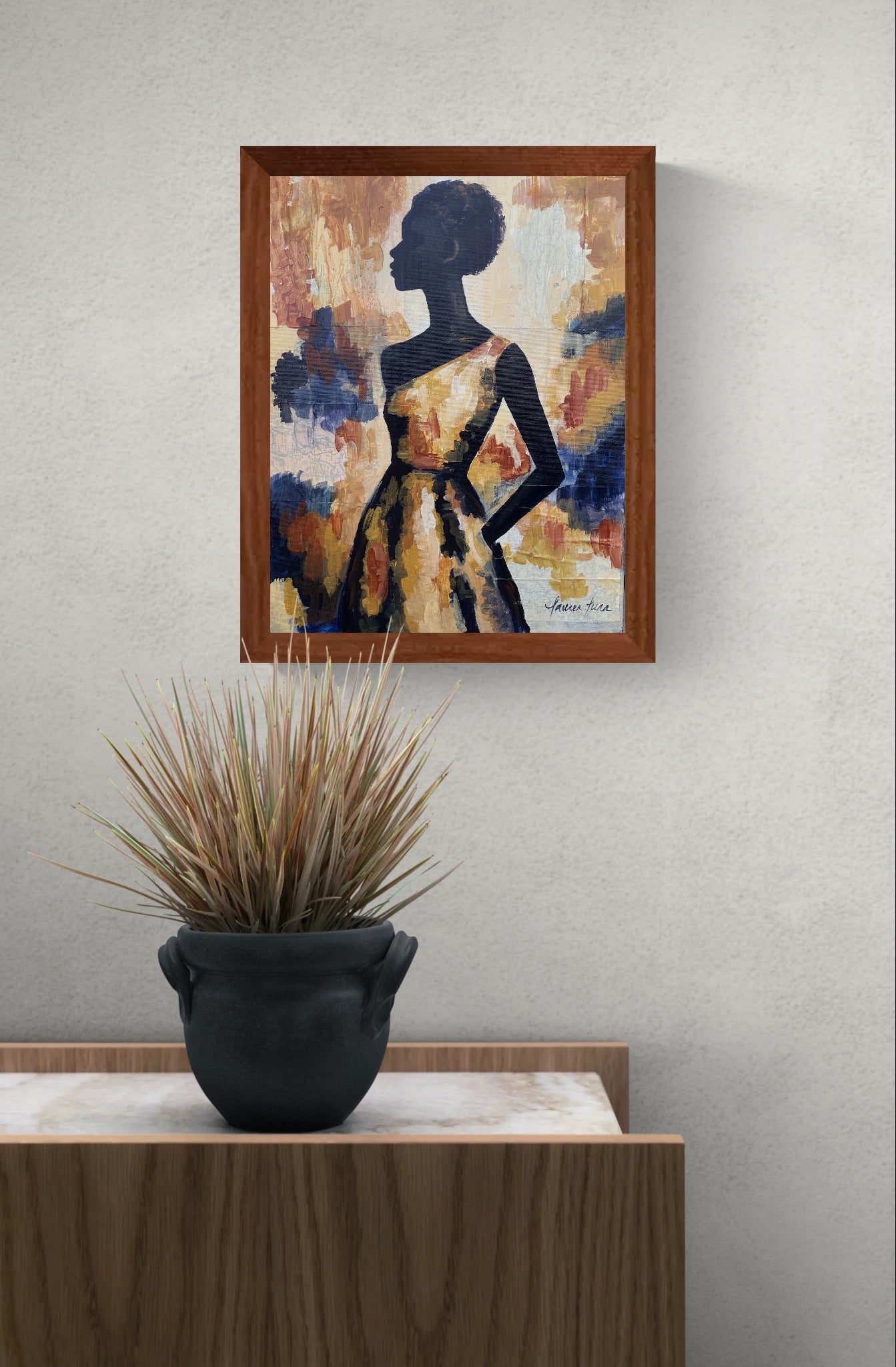 This artwork embodies the beauty of transition and the grounding energy of fall. Layers of paint and pattern create depth and movement, while the silhouette anchors the composition with grace and confidence.