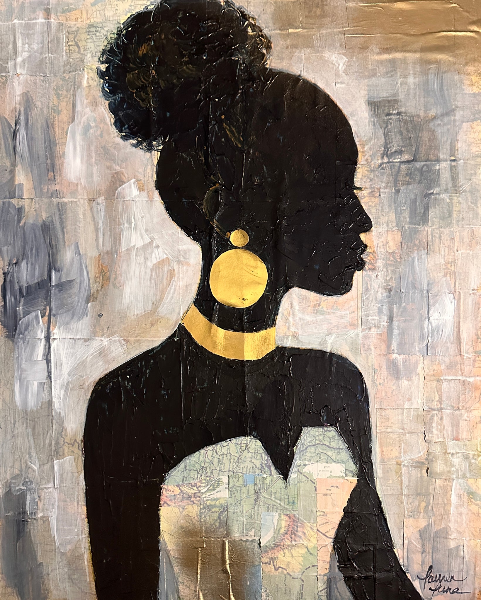 City Glamour is a striking celebration of style, confidence, and modern femininity. This mixed-media portrait blends layered city maps, textured paint, and rich acrylic tones to create a powerful silhouette illuminated by bold gold details. Her oversized earrings, gleaming collar, and high textured bun become focal points—echoing both contemporary fashion and timeless elegance.