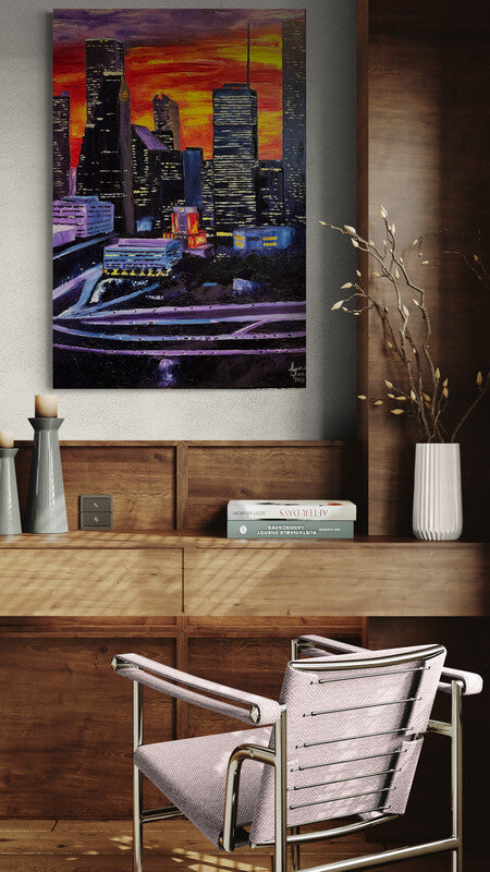 This luminous composition captures the heartbeat of Houston as day surrenders to night—vivid, unrelenting, and alive with possibility.