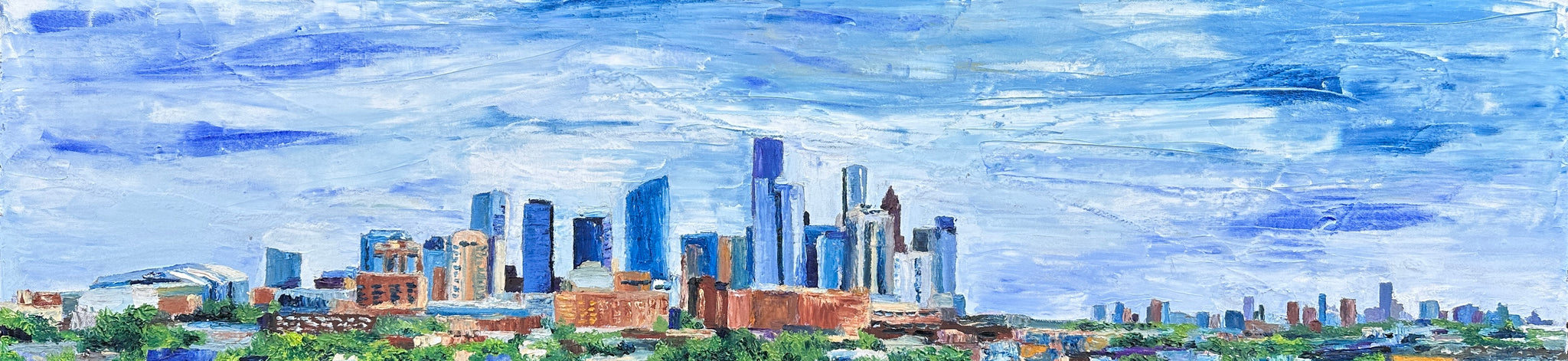 Houston Panoramic stretches across the canvas like a love letter to the city’s sprawling spirit, uniting its many “downtowns” into a single sweeping skyline. Layered in crisp strokes of cerulean, sienna, and slate, the composition captures Houston’s architectural patchwork—gleaming towers, brick warehouses, and tree-lined districts—stitched together beneath an expansive, cloud-brushed sky.