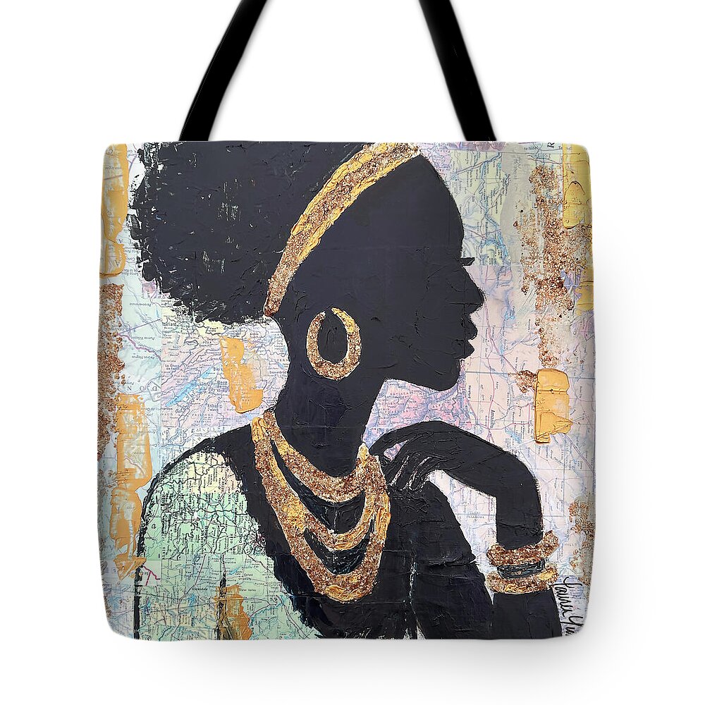 Purchase a tote bag featuring the painting "Golden Cartography" by Lauren Luna. Our tote bags are made from soft, durable, poly-poplin fabric and include a 1" black strap for easy carrying on your shoulder. All seams are double-stitched for added durability. Each tote bag is machine-washable in cold water and is printed on both sides using the same image.
